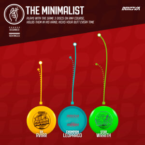 Don’t judge a book by its cover – the Minimalist can do more with three discs than most can do with a full bag. It’s all about knowing the discs you’re throwing and committing to your shots.